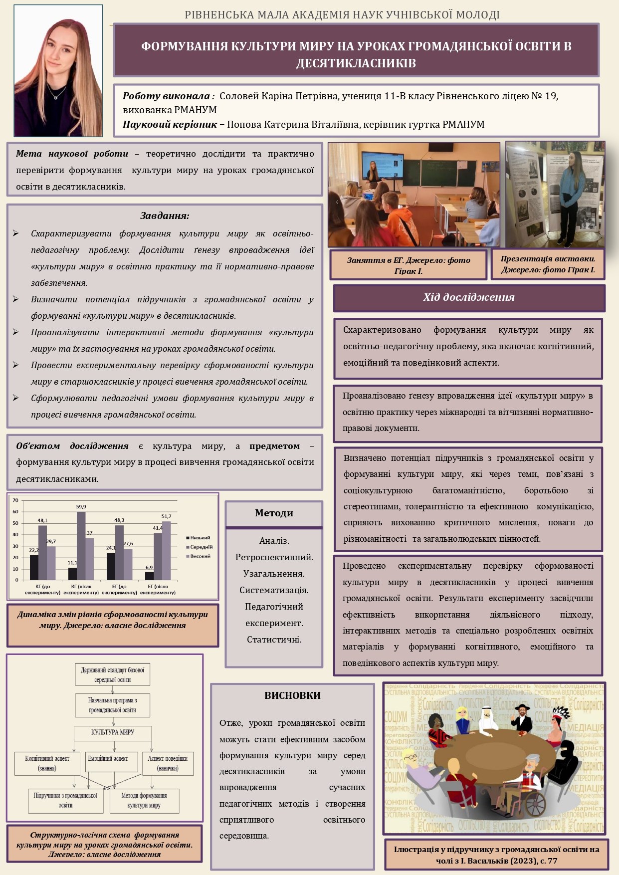 ФОРМУВАННЯ КУЛЬТУРИ МИРУ НА УРОКАХ ГРОМАДЯНСЬКОЇ ОСВІТИ В ДЕСЯТИКЛАСНИКІВ Опубліковано: 11.06.202511.06.2025 by adminhq СОЛОВЕЙ Каріна Петрівна Секція ‘Педагогіка’