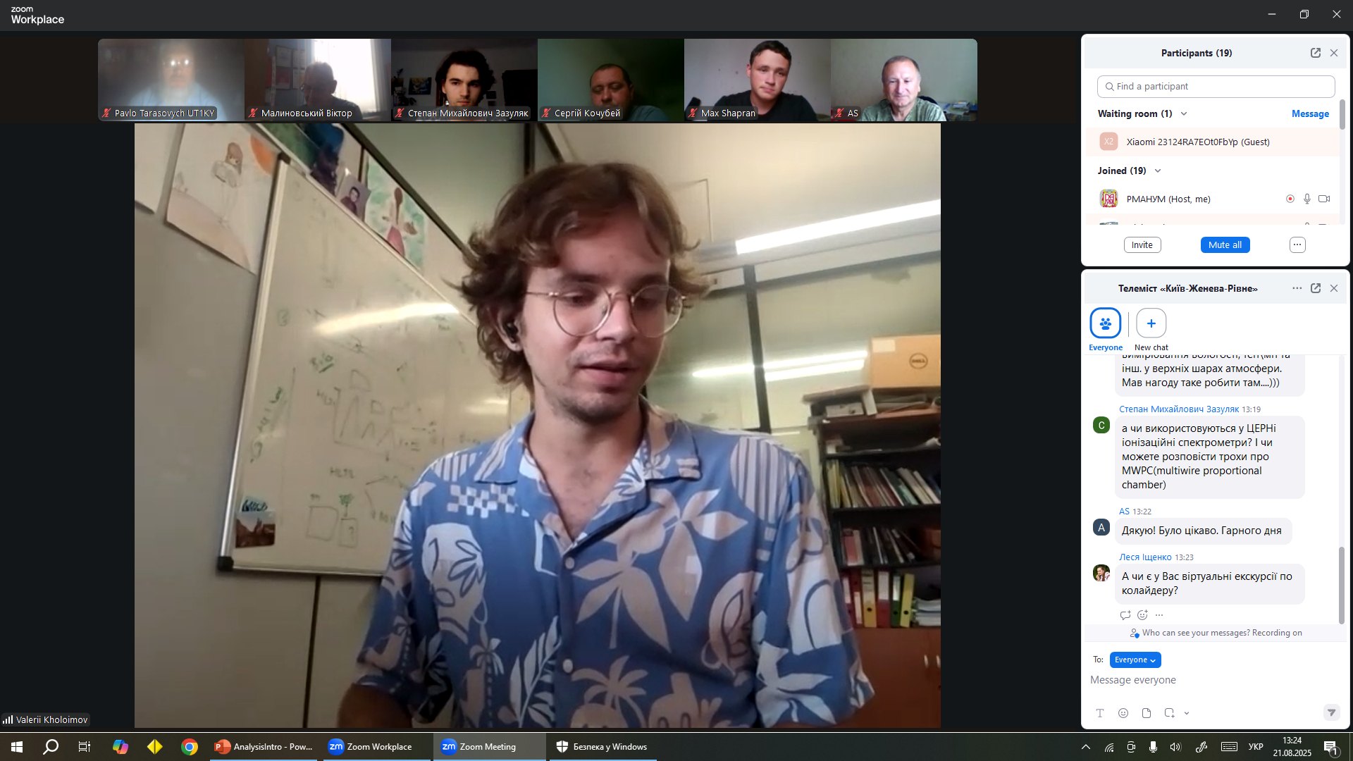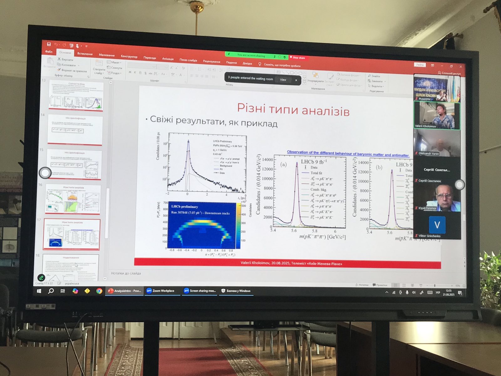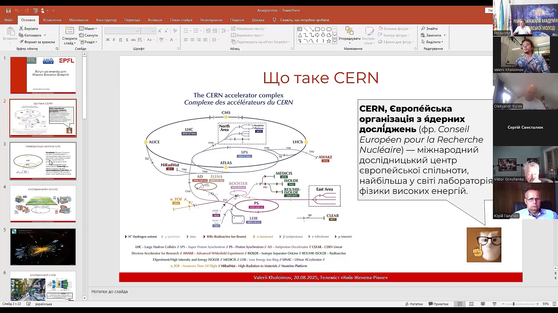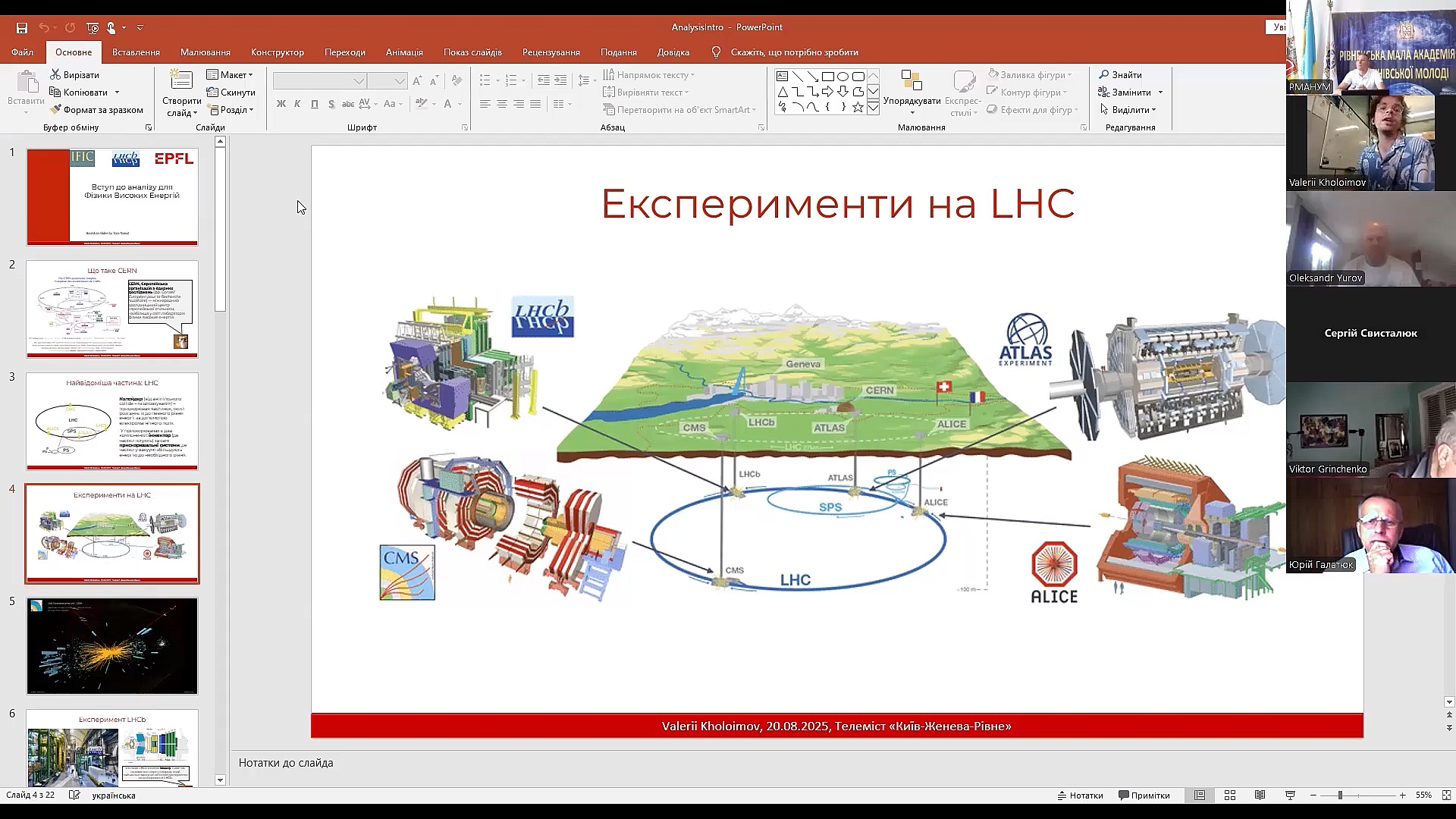 Молодий науковець з України, спікер ‒ Валерій Холоімов, співробітник Інституту фізики частинок Університету Валенсії, фізик-експериментатор на експерименті LHCb, CERN; волонтер-спікер онлайн-школи ЦЕРН для педагогів України-2024, розповів та показав наочно як працює Великий адронний колайдер, як здійснюється обробка й аналіз даних, що отримують у результаті здійснення експериментів на найсучаснішому в світі інструменті для досліджень у сфері фізики високих енергій.