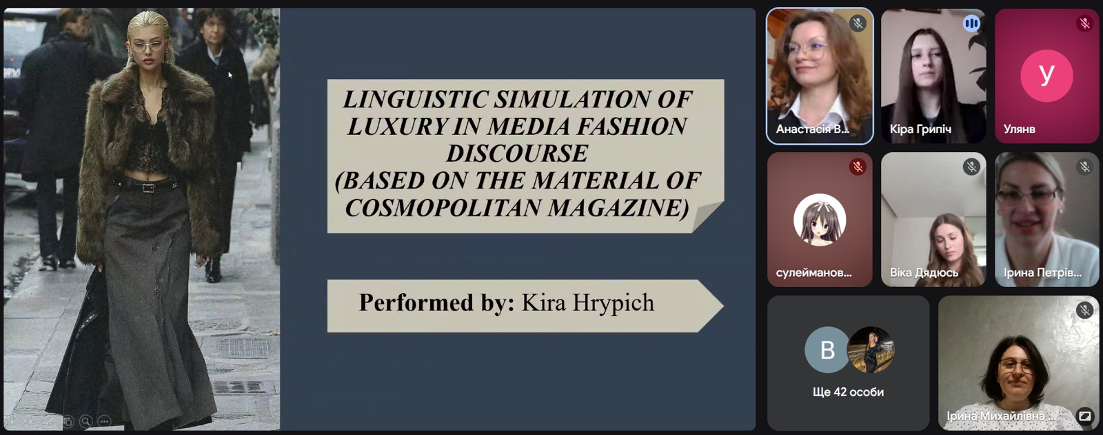 • Кіра Грипіч, учениця 9 класу Костопільського ліцею №4 Костопільської міської ради, презентувала доповідь “Linguistic Simulation of Luxury in Media Fashion Discourse (Based on the Material of Cosmopolitan Magazine)”, розкрила мовні механізми формування уявлення про розкіш у сучасному медійному дискурсі моди;