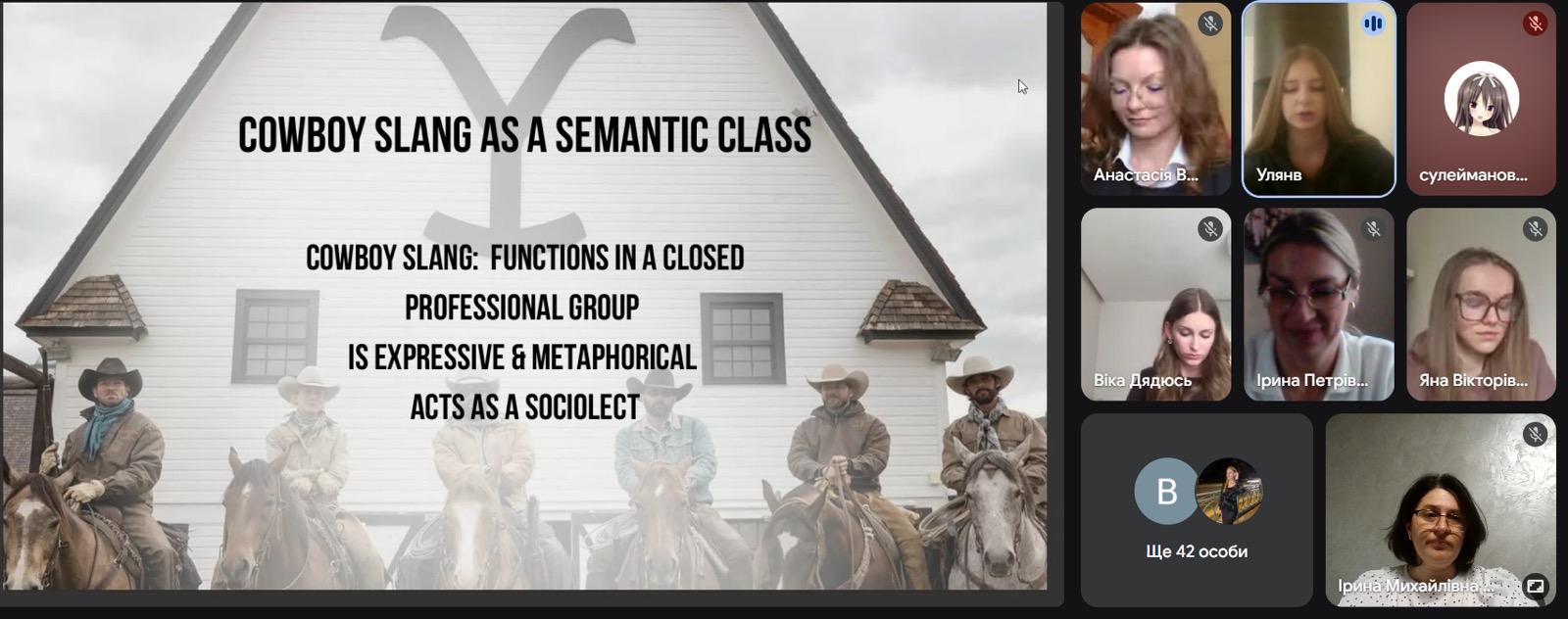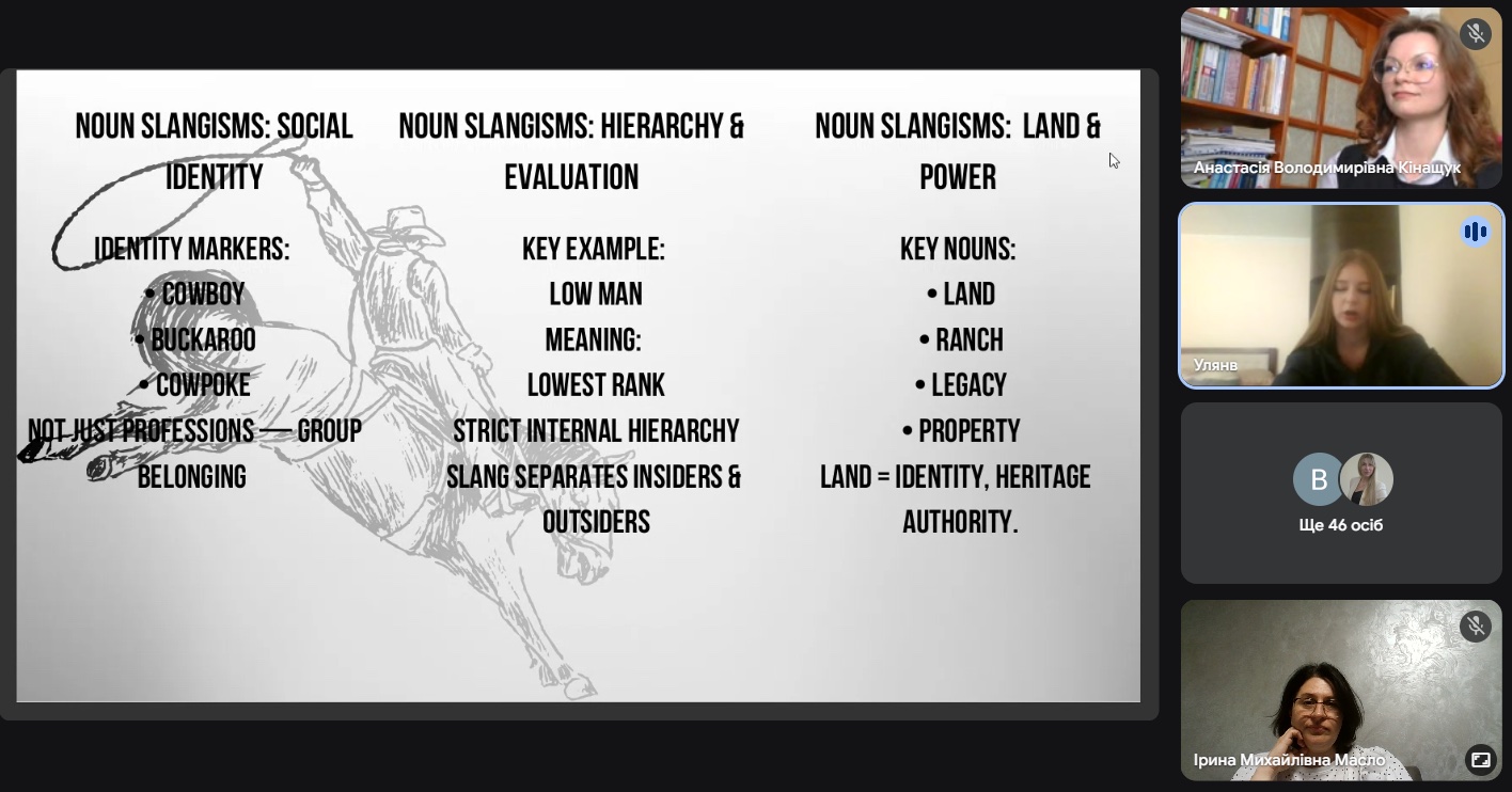 • Уляна Бойко, учениця 8 класу Рівненського ліцею № 7 Рівненської міської ради, презентувала доповідь “Lexico-semantic Analyses of Cowboy Slang in the TV Series “Yellowstone””. У науковій роботі вона провела лексико-семантичний аналіз ковбойського сленгу, простеживши особливості його функціювання та стилістичну роль у сучасному англомовному медіапросторі.