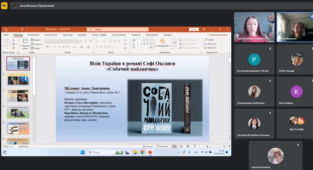 2 квітня 2024 року у Національному авіаційному університеті стартувала XXIІІ Міжнародна науково-практична конференція здобувачів вищої освіти і молодих учених «Політ. Сучасні проблеми науки», в межах якої упродовж кількох днів юні дослідники РМАНУМ відділень філології і літературознавства, фольклористики та мистецтвознавства мають можливість не тільки апробувати свої науково-дослідницькі проєкти перед ІІІ етапом Всеукраїнського конкурсу-захисту, а й здобути безцінний досвід спілкування з провідними вченими України. Під час роботи секції «Лінгвокультурологія» доповіді тримали переможці ІІ етапу Всеукраїнського конкурсу-захисту науково-дослідницьких робіт учнів – членів МАН України: Анастасія Рузаєва та Станіслав Олексійчук, одинадцятикласники Обласного наукового ліцею в м. Рівне Рівненської обласної ради; Олександра Грабовець та Юлія Грицай, студентки ІІ курсу ВСП «Рівненський економіко-технологічний фаховий коледж НУВГП»; Мовчанюк Анастасія та Анна Малонос, учениці 9 та 10 класів Рівненського ліцею № 27 Рівненської міської ради. Наукові й творчі здобутки юних учених охоплюють актуальну мілітарну проблематику, аспекти становлення української національної ідентичності, візії представлення України у світі та майбутнього людства.